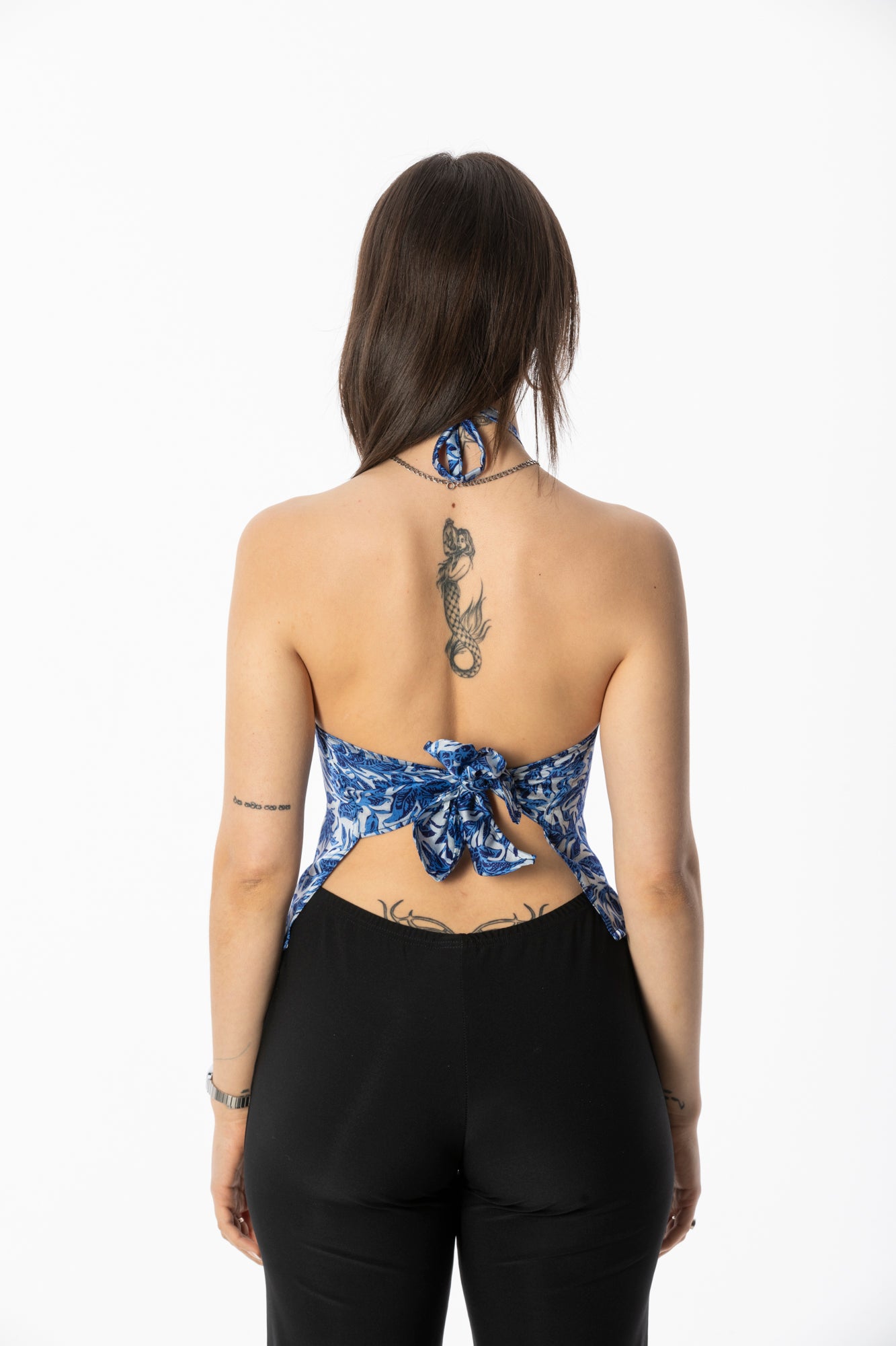 Handmade halter top in 100% silk, featuring a traditional hand-stamped batik design in floral blue. Cut with a backless silhouette and adjustable tie neckline for a flexible, flattering fit. Paired with a matching headband to complete the look. Each piece is one-size and uniquely hand-printed, celebrating the craft of Balinese artisans. As each piece is handmade and hand-printed, slight variations in print and colour are part of its character.
