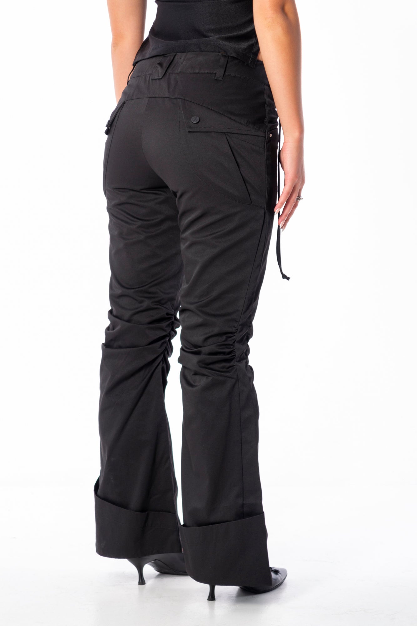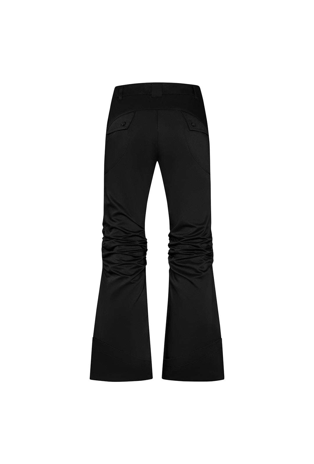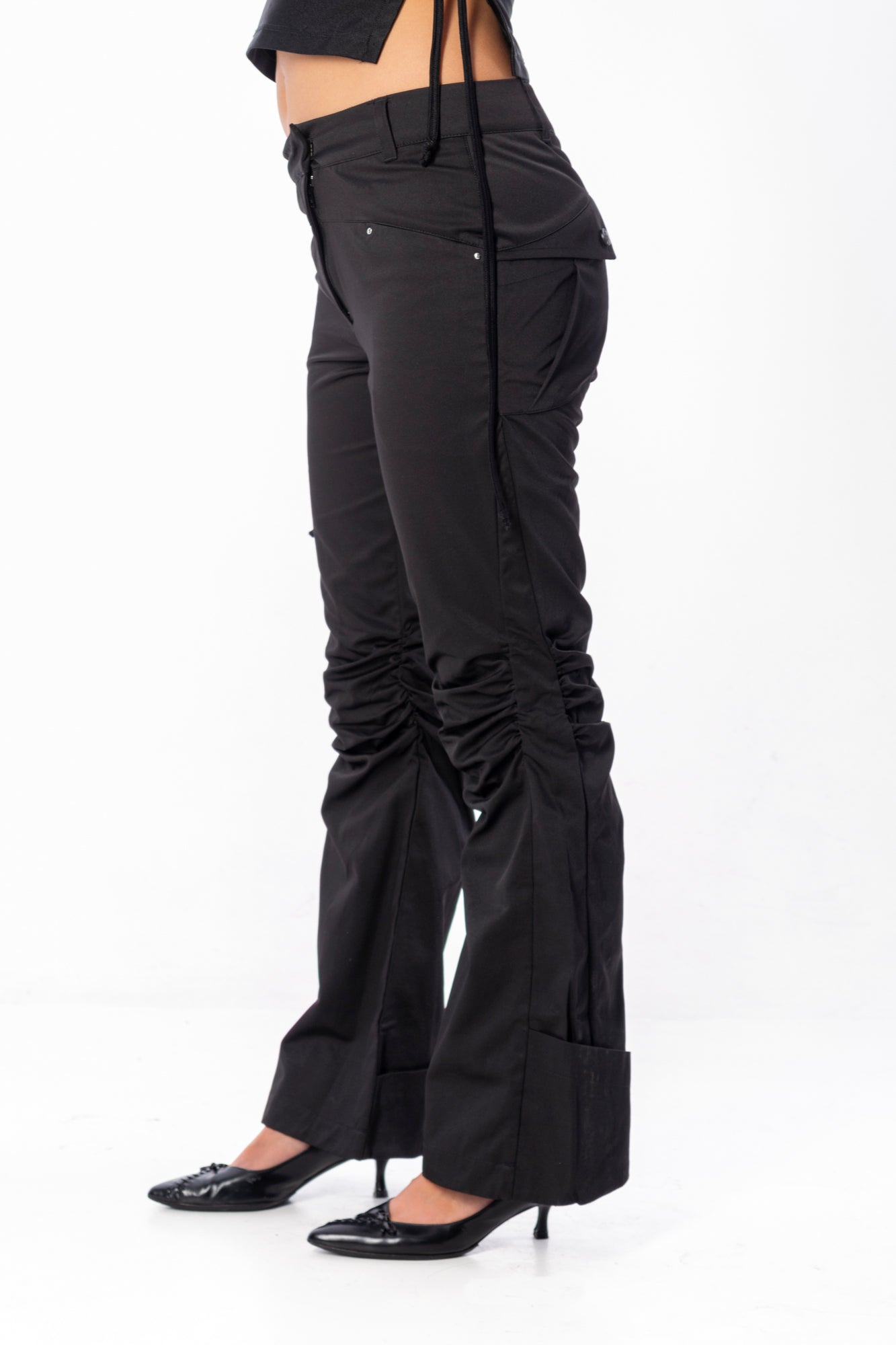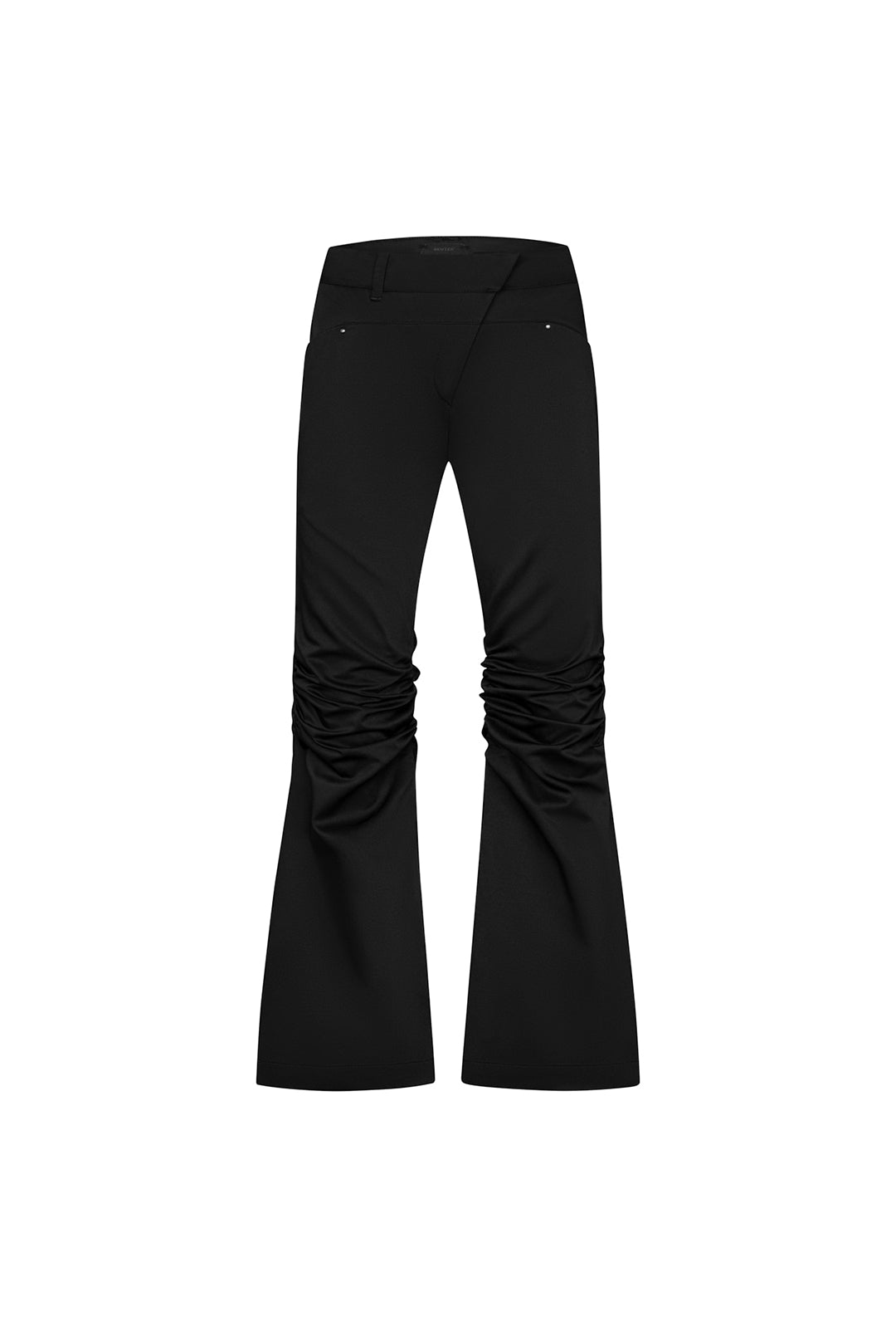 A sleek black flare trouser that blends style with function. Features a flattering low to mid-rise fit with a unique asymmetrical front closure and subtle silver stud detailing. The subtle ruched seams along the knees create a tailored, elongated silhouette that flows into a flared hem. Finished with a hidden hook fastening, diagonal stitch accents, and angled flap back pockets. The deconstructed flipped-back hem adds a directional edge, while belt loops and a gently structured waistband complete the look. Crafted from a smooth, durable 70% polyester, 30% spandex blend for comfort and movement.