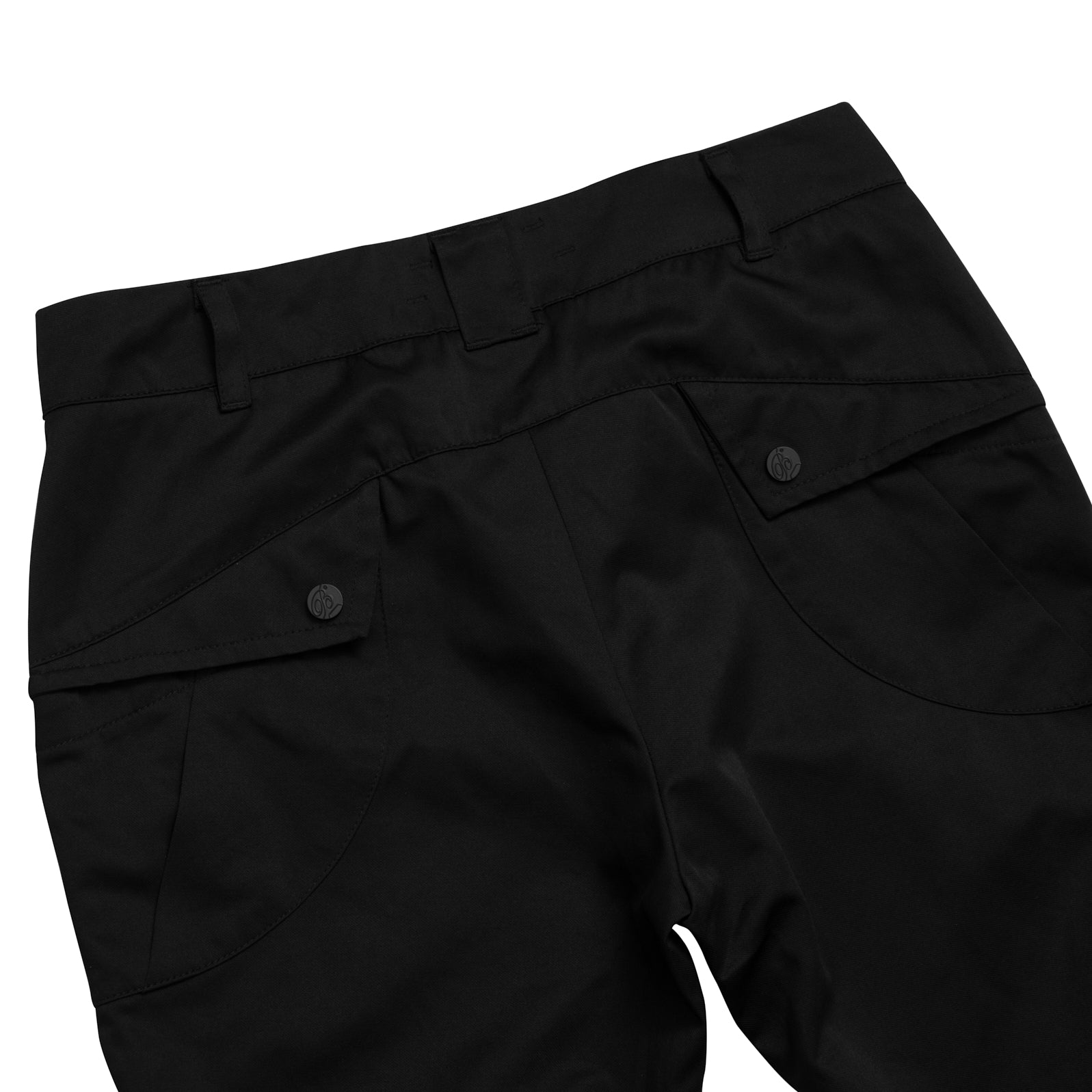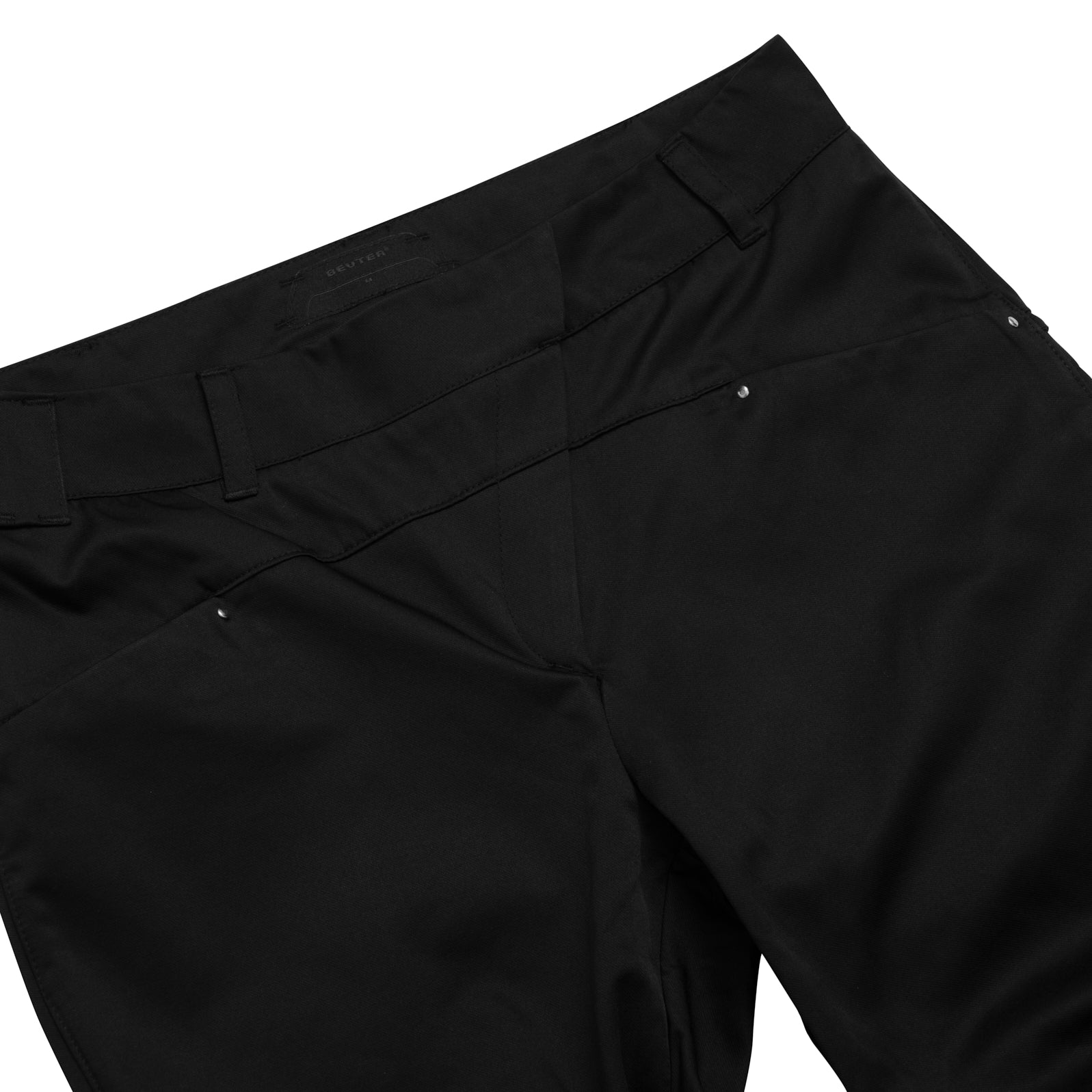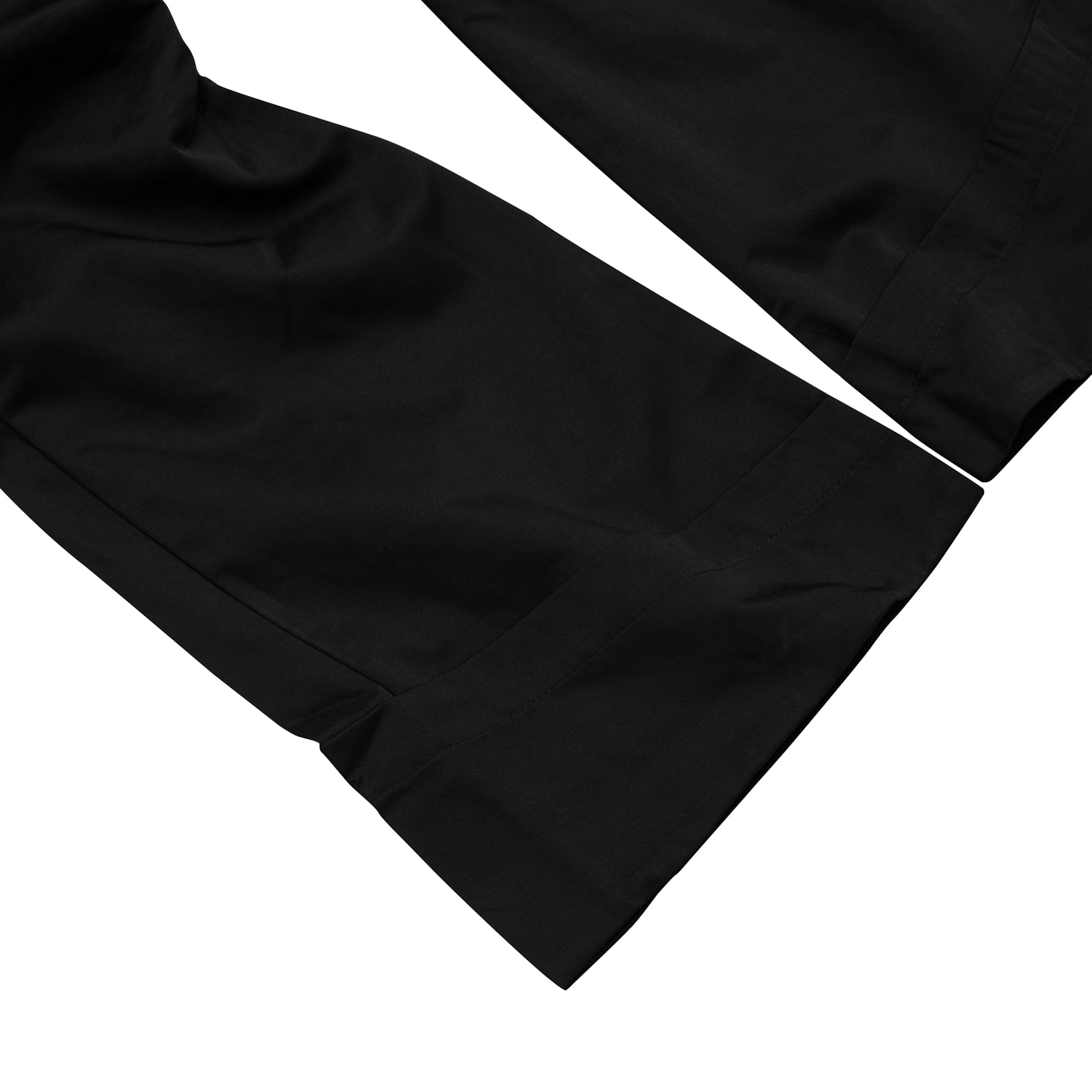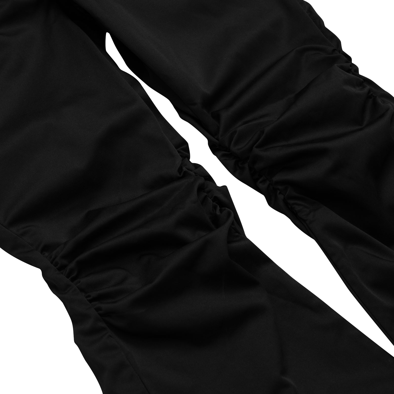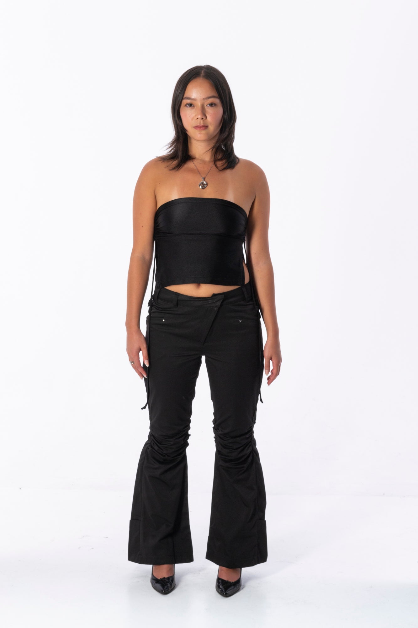A sleek black flare trouser that blends style with function. Features a flattering low to mid-rise fit with a unique asymmetrical front closure and subtle silver stud detailing. The subtle ruched seams along the knees create a tailored, elongated silhouette that flows into a flared hem. Finished with a hidden hook fastening, diagonal stitch accents, and angled flap back pockets. The deconstructed flipped-back hem adds a directional edge, while belt loops and a gently structured waistband complete the look. Crafted from a smooth, durable 70% polyester, 30% spandex blend for comfort and movement.