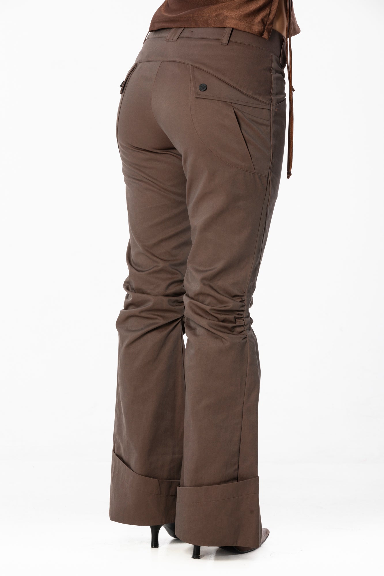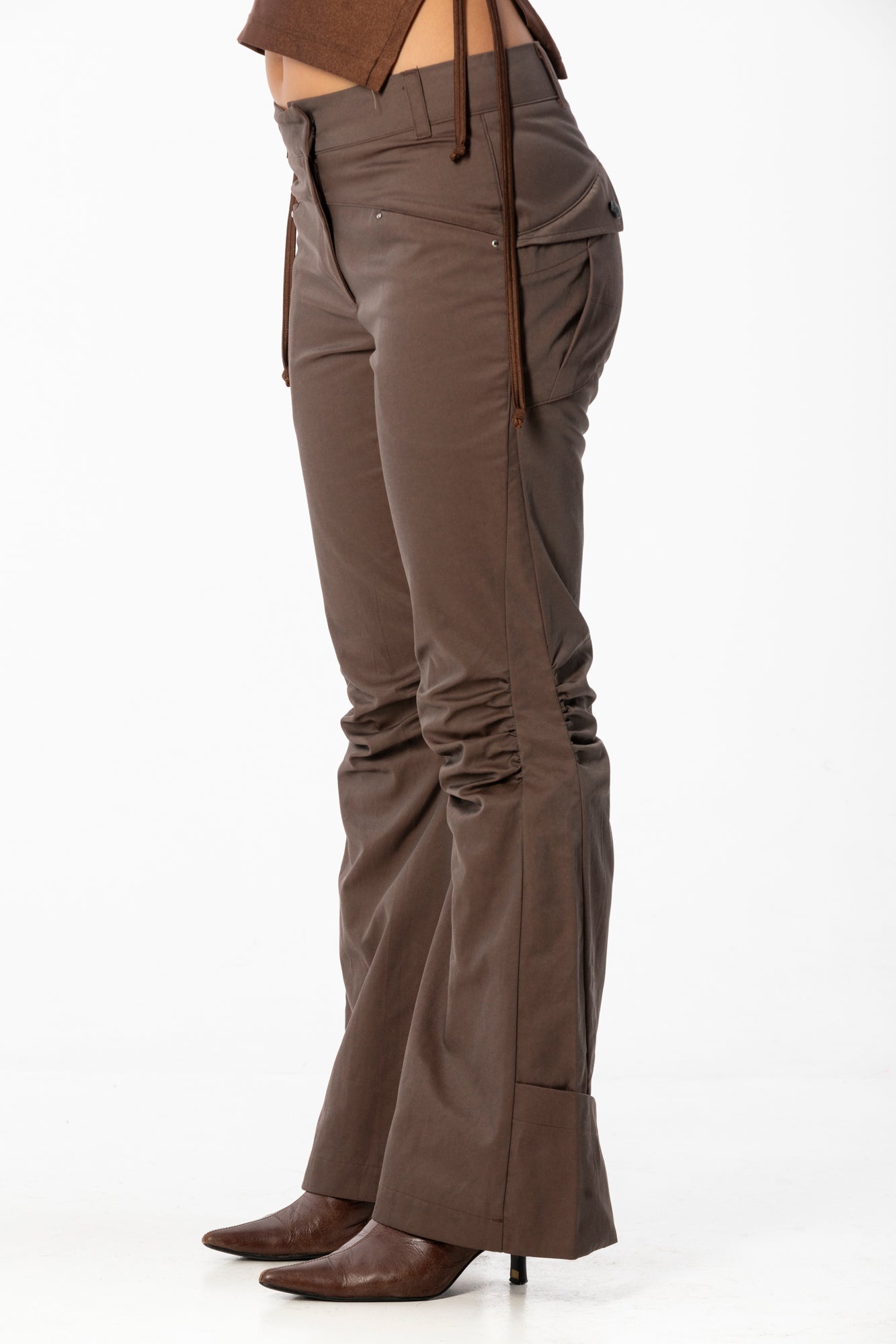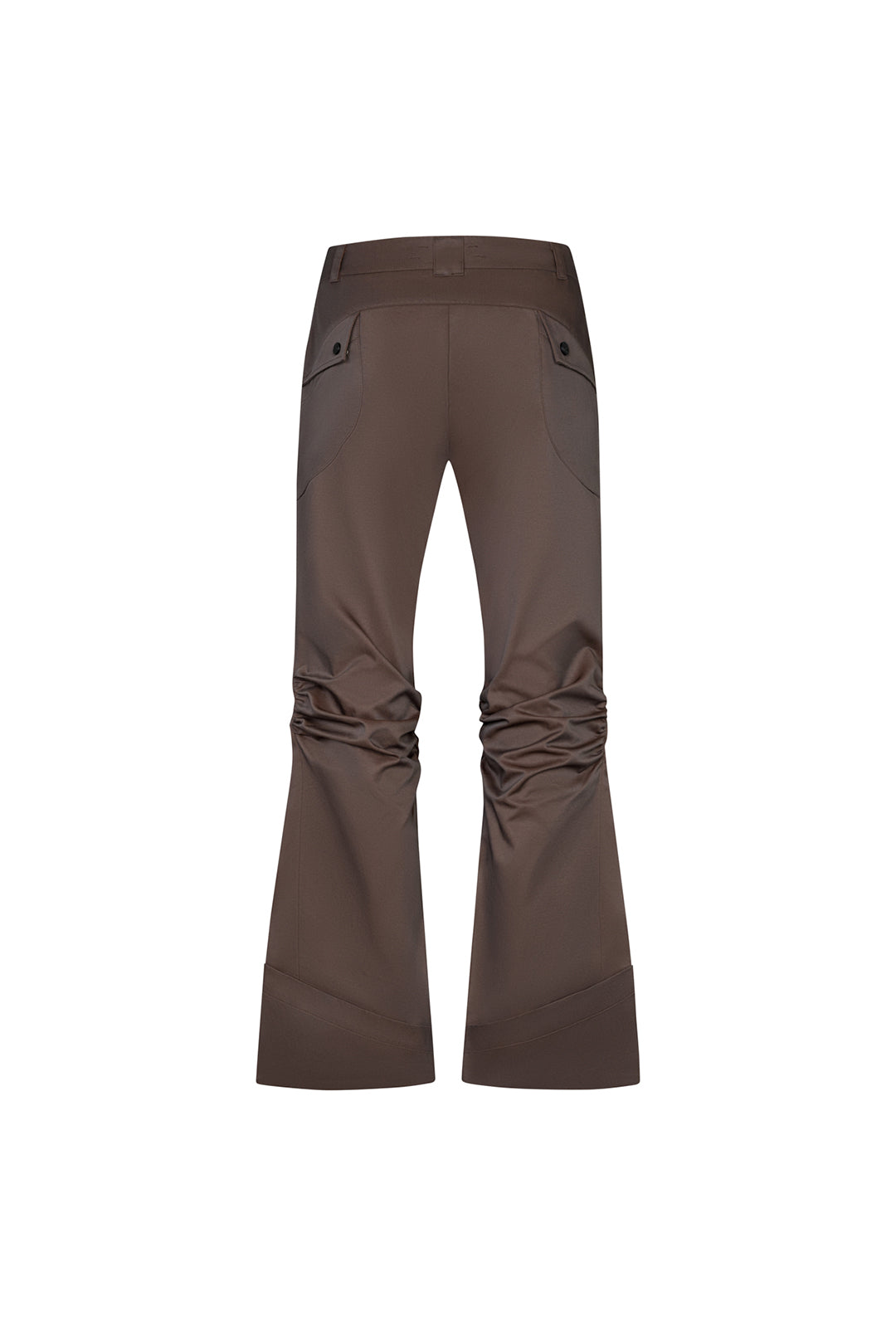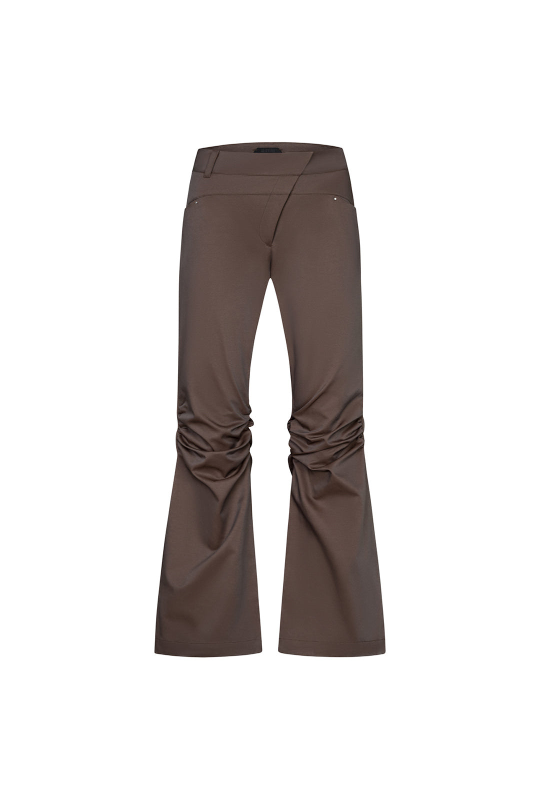 A sleek mocha flare trouser that blends style with function. Features a flattering low to mid-rise fit with a unique asymmetrical front closure and subtle silver stud detailing. The subtle ruched seams along the knees create a tailored, elongated silhouette that flows into a flared hem. Finished with a hidden hook fastening, diagonal stitch accents, and angled flap back pockets. The deconstructed flipped-back hem adds a directional edge, while belt loops and a gently structured waistband complete the look. Crafted from a smooth, durable 70% polyester, 30% spandex blend for comfort and movement.