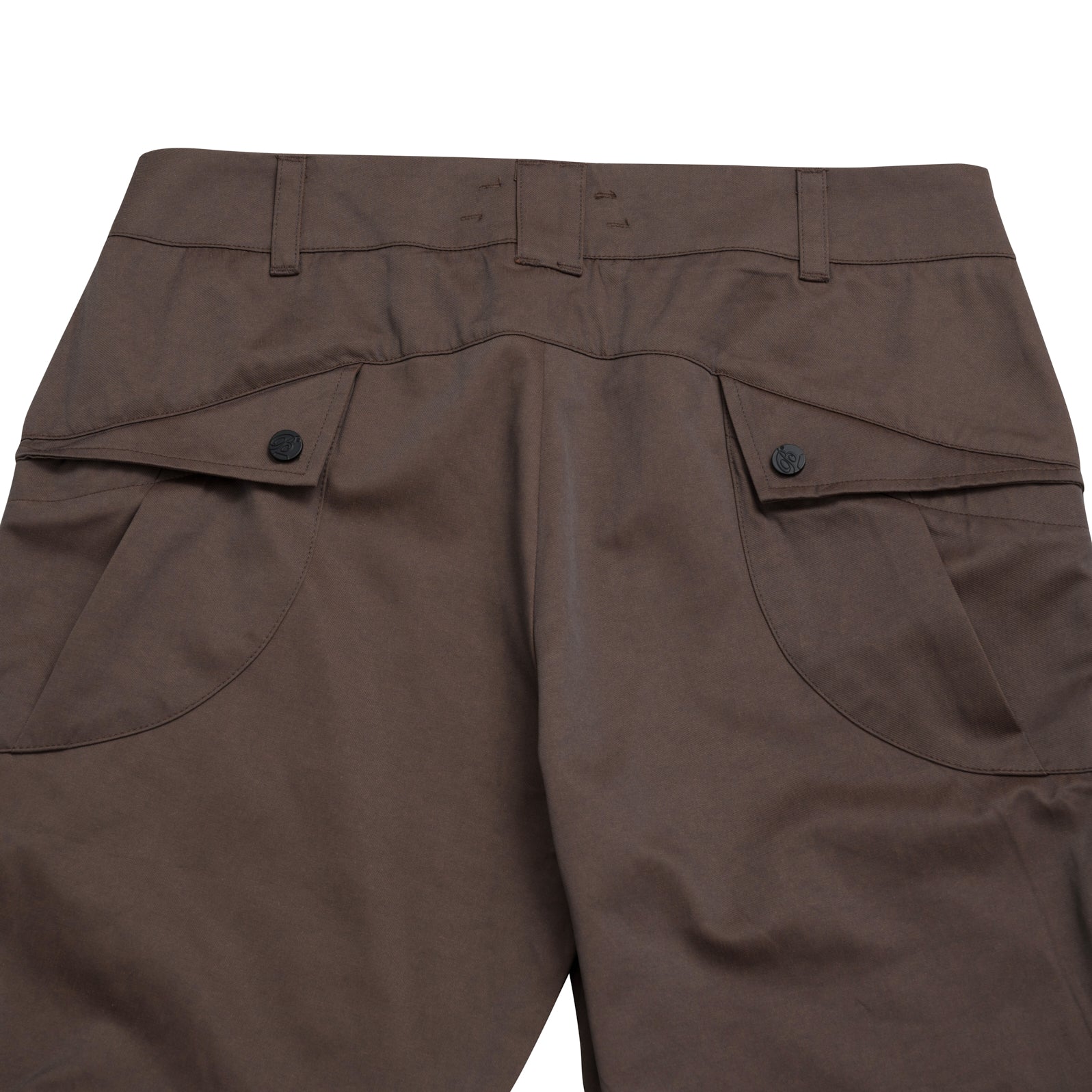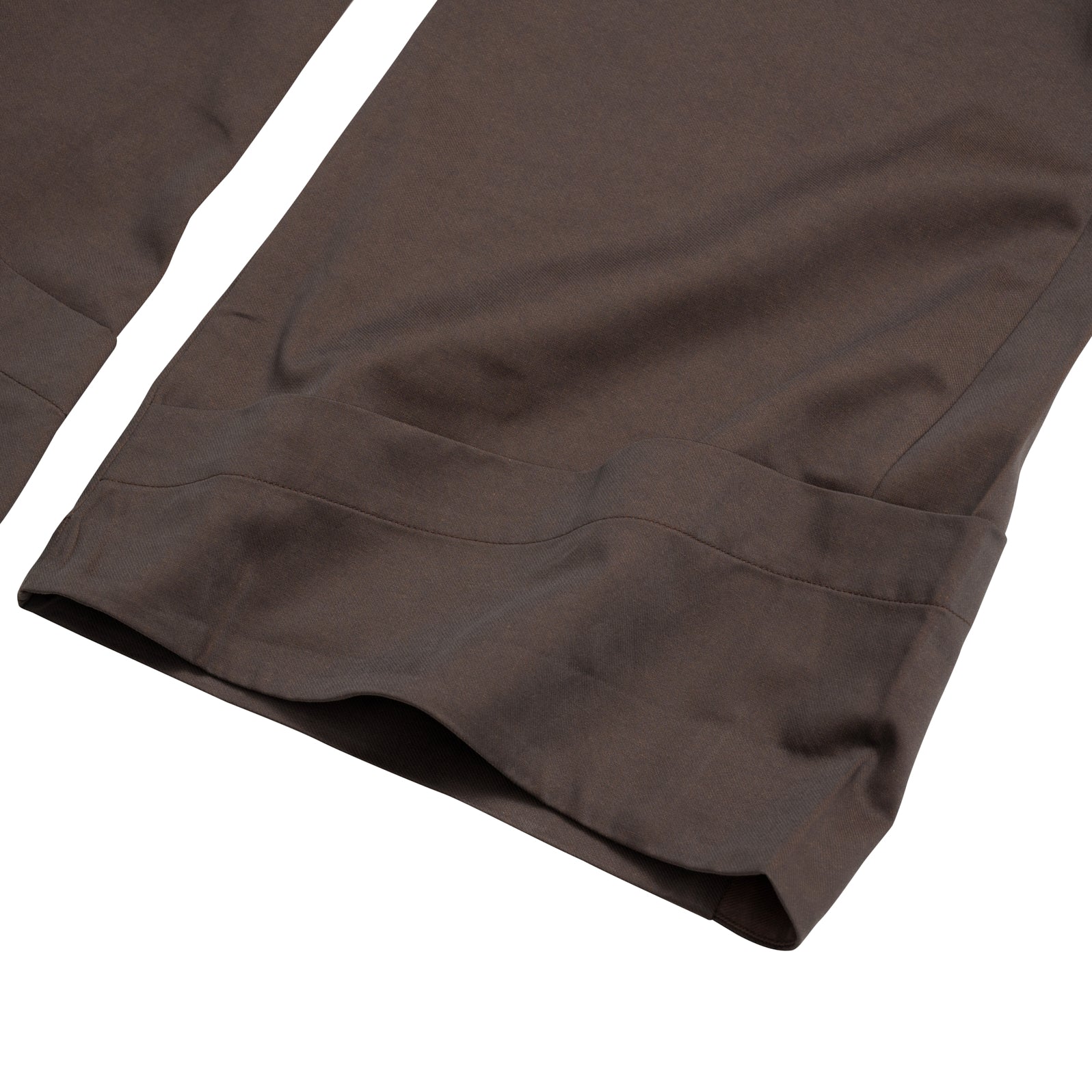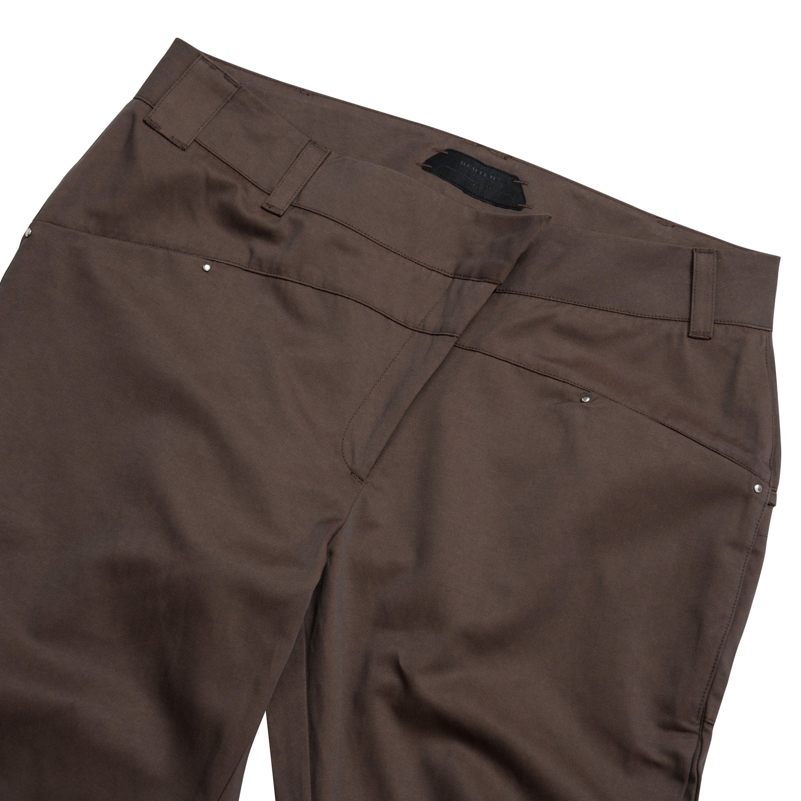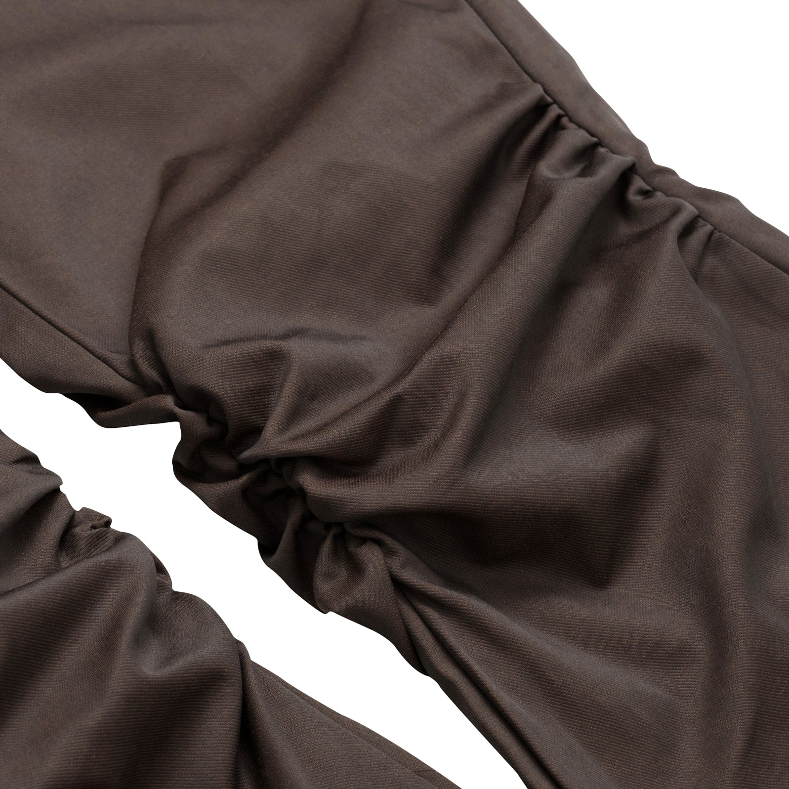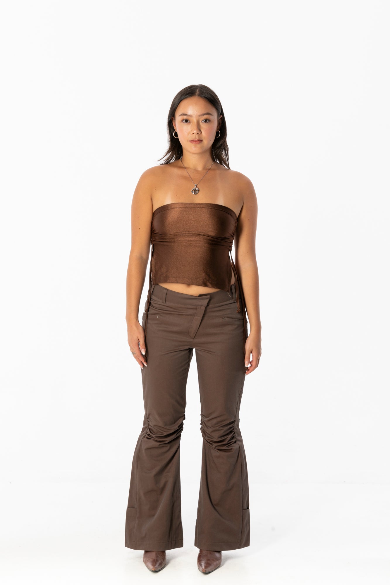 A sleek mocha flare trouser that blends style with function. Features a flattering low to mid-rise fit with a unique asymmetrical front closure and subtle silver stud detailing. The subtle ruched seams along the knees create a tailored, elongated silhouette that flows into a flared hem. Finished with a hidden hook fastening, diagonal stitch accents, and angled flap back pockets. The deconstructed flipped-back hem adds a directional edge, while belt loops and a gently structured waistband complete the look. Crafted from a smooth, durable 70% polyester, 30% spandex blend for comfort and movement.